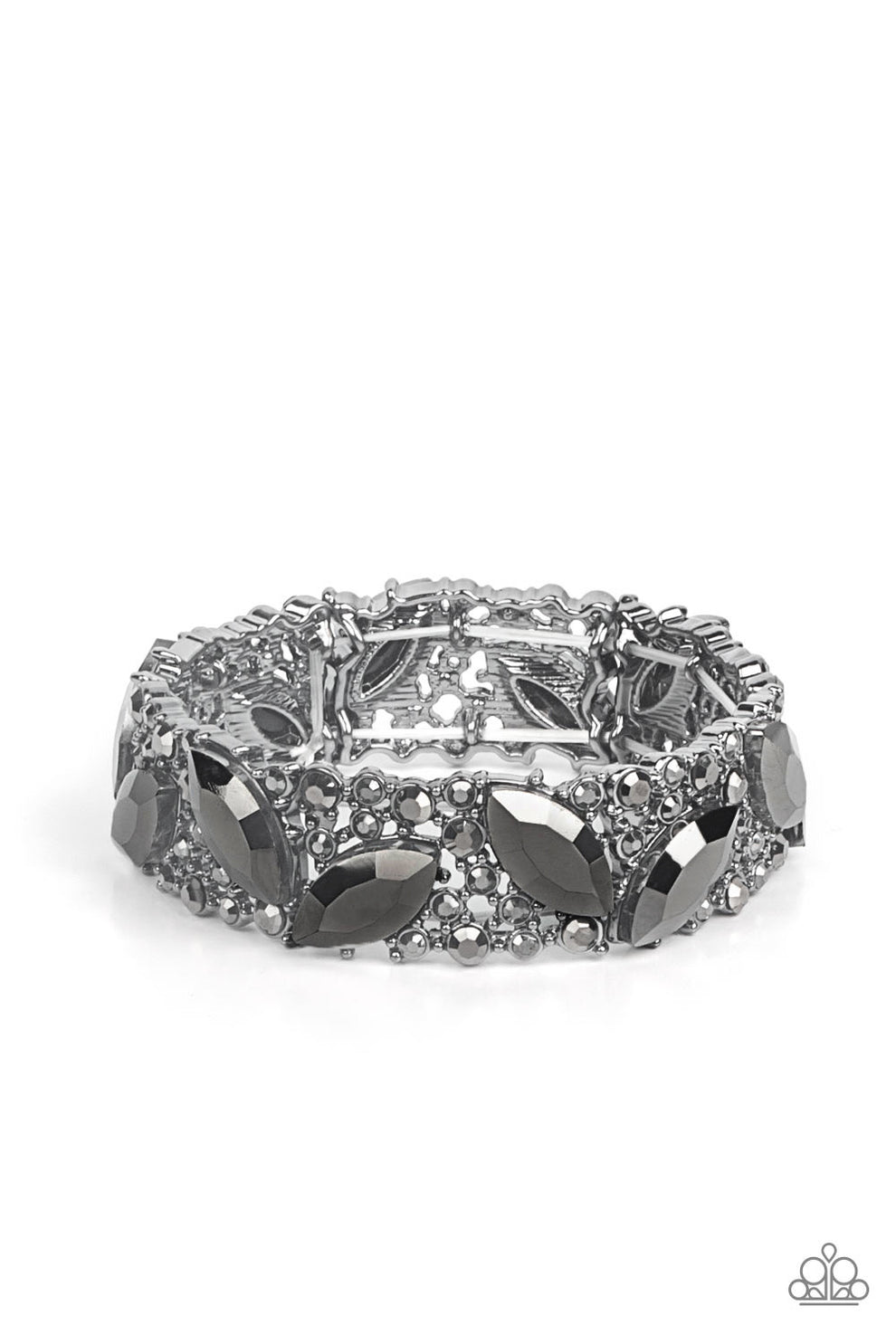 Oversized marquise cut white rhinestones sparkle atop icy frames of dainty silver studs and white rhinestones that are threaded along stretchy bands around the wrist for a jaw-dropping dazzle.