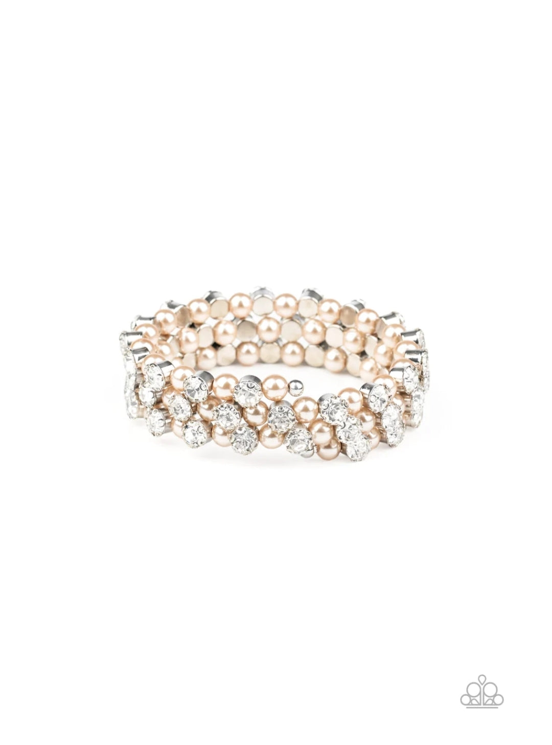 Paparazzi Accessories Metro Motif - Brown Bracelets Accessories glittery white rhinestones alternate with classy brown pearls along a coiled wire, creating an elegant infinity wrap bracelet around the wrist.