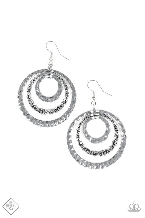 A rippling stack of hammered and filigree-filled silver hoops radiates from the ear, coalescing into a dizzying frame. Earring attaches to a standard fishhook fitting. Sold as one pair of earrings.