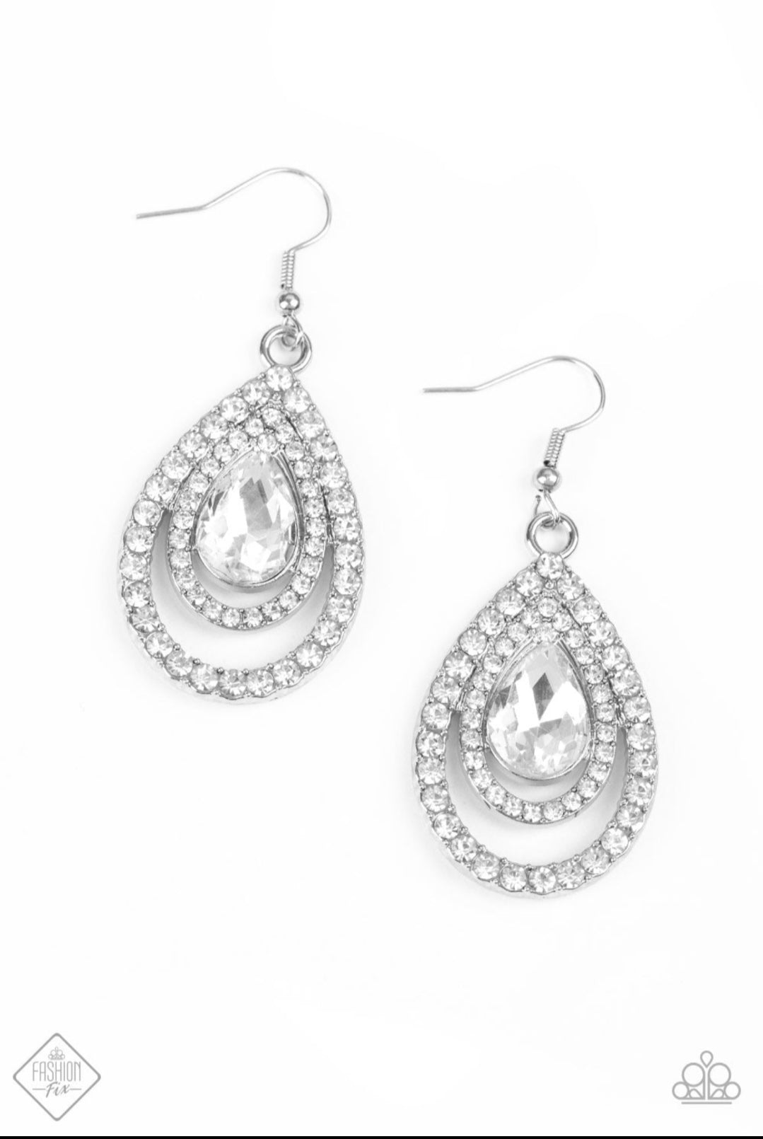 An oversized white teardrop gem is nestled inside two expansive teardrop frames encrusted in dainty white rhinestones, creating a rippling radiance.