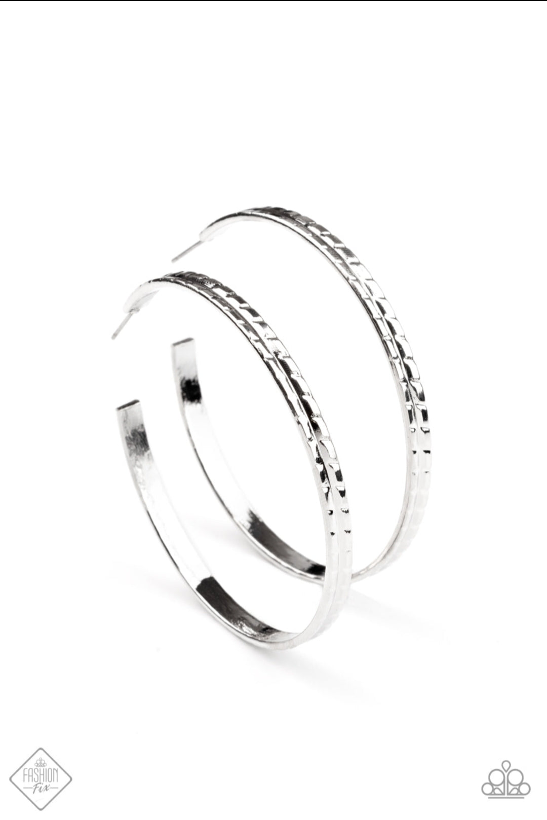 An oversized silver hoop etched and embossed in a tread-like pattern curls around the ear for an edgy look. Earring attaches to a standard post fitting. Hoop measures approximately 2 1/4" in diameter.