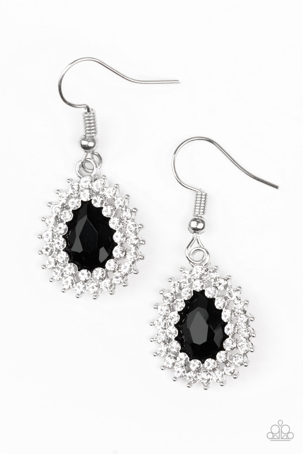 A faceted black teardrop gem is pressed into the center of a double stacked frame radiating with glassy white rhinestones for a glamorous look. Earring attaches to a standard fishhook fitting.
