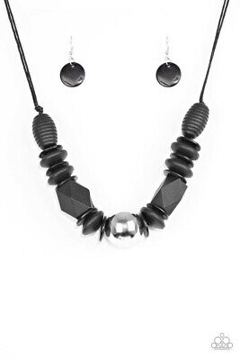 Featuring abstract geometric finishes, mismatched black wooden beads are threaded along shiny black cording. A dramatic silver bead adorns the center, creating a bold seasonal look below the collar. Features a button loop closure.