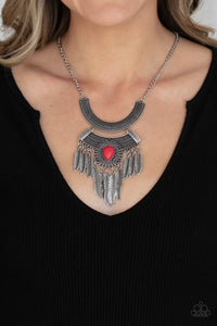 A red teardrop stone dots an ornately scalloped silver frame that adorns the center of a curved metal plate that links to the bottom of an oversized curved studded plate. Mismatched silver feathers trickle from the bottom of the stacked pendant, creating a whimsical fringe. Features an adjustable clasp closure.