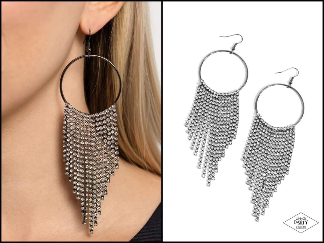 Tapered rows of glittery white rhinestones cascade from the bottom of a shiny gunmetal hoop, creating a glamorously glitzy fringe. Earring attaches to a standard fishhook fitting. Sold as one pair of earrings.