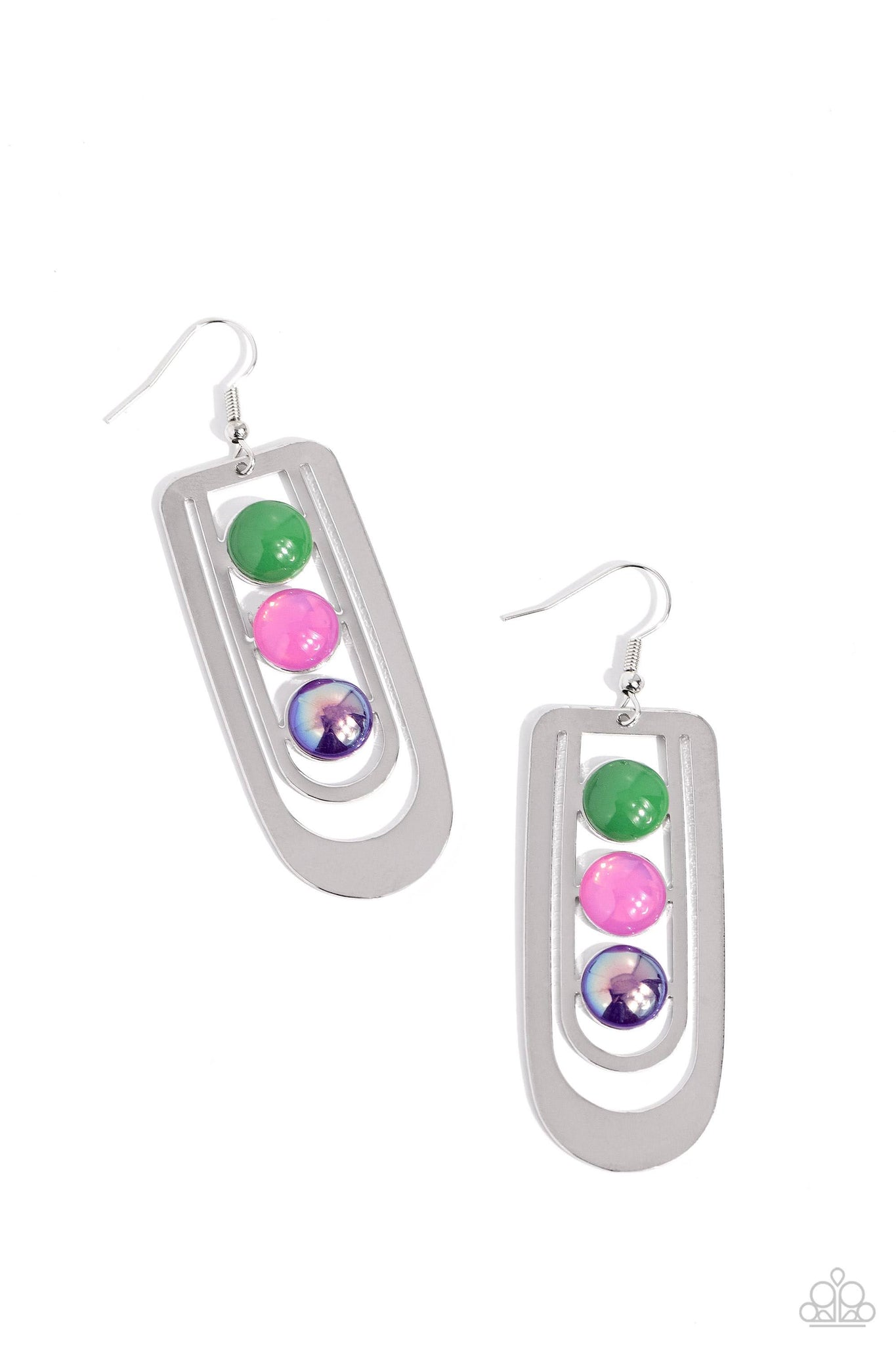 Kohlrabi acrylic, Rose Violet opal, and plum UV-splashed beads are set in the center of two overlapping silver oval-shaped frames, creating a rippling lure. Earring attaches to a standard fishhook fitting.