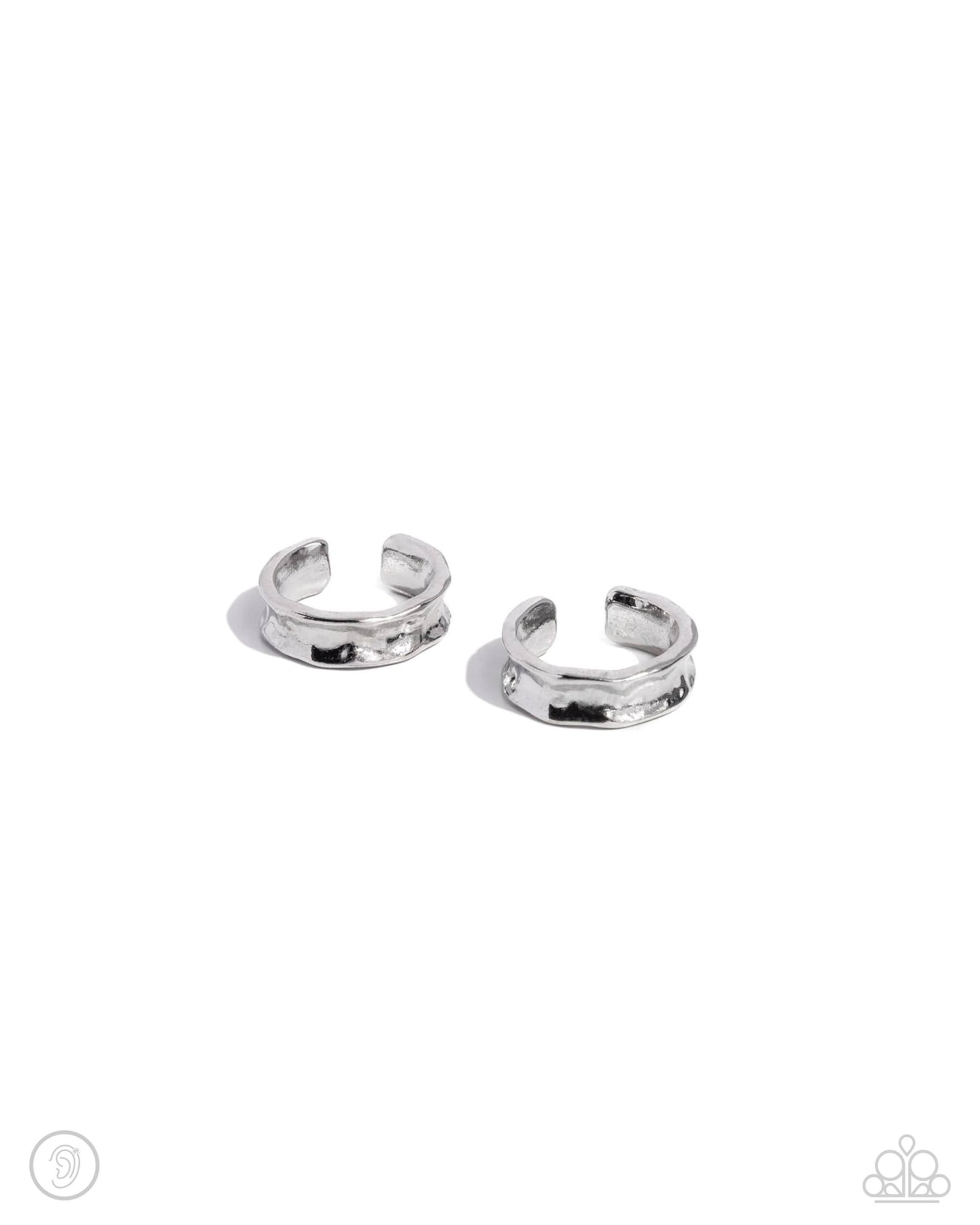 Featuring a concaved, hammered texture, a thick silver hoop curls around the ear for a mesmerizing, one-size-fits-all cuff.