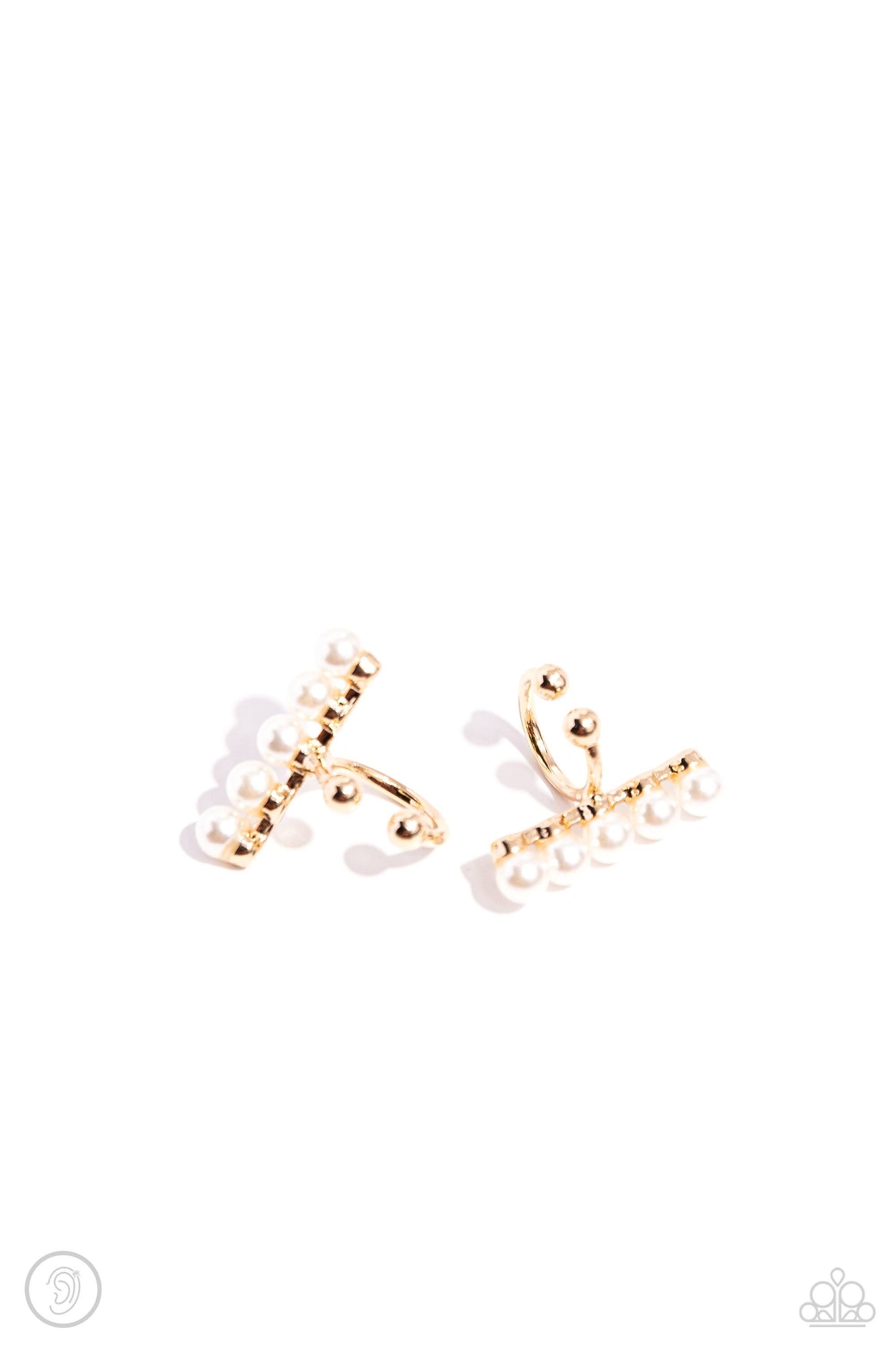 A small, skinny, gold hoop curves around the ear in a timeless fashion. Dainty gold balls are affixed to the ends of the hoop, reminiscent of a barbell fitting. Glossy white pearls elongate up one side of the one-size-fits-all cuff, creating a refined centerpiece.