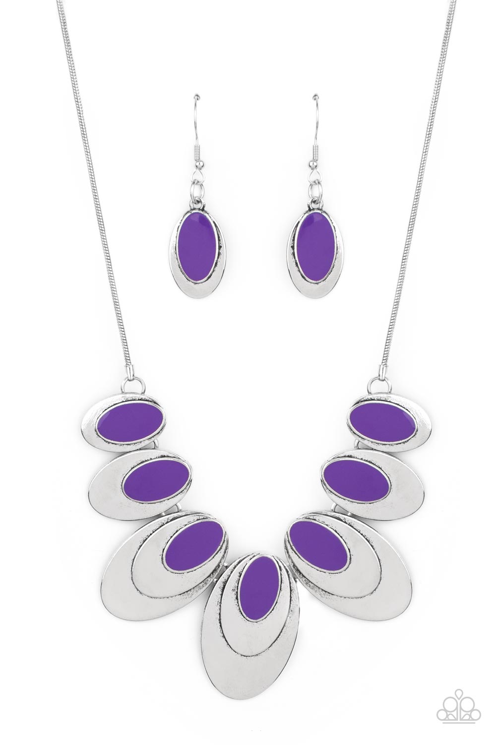 A row of stacked oval silver plates in graduating sizes and crowned with a glossy purple oval, link together and connect to a round silver chain creating an out-of-this-world statement below the collar. Features an adjustable clasp closure.