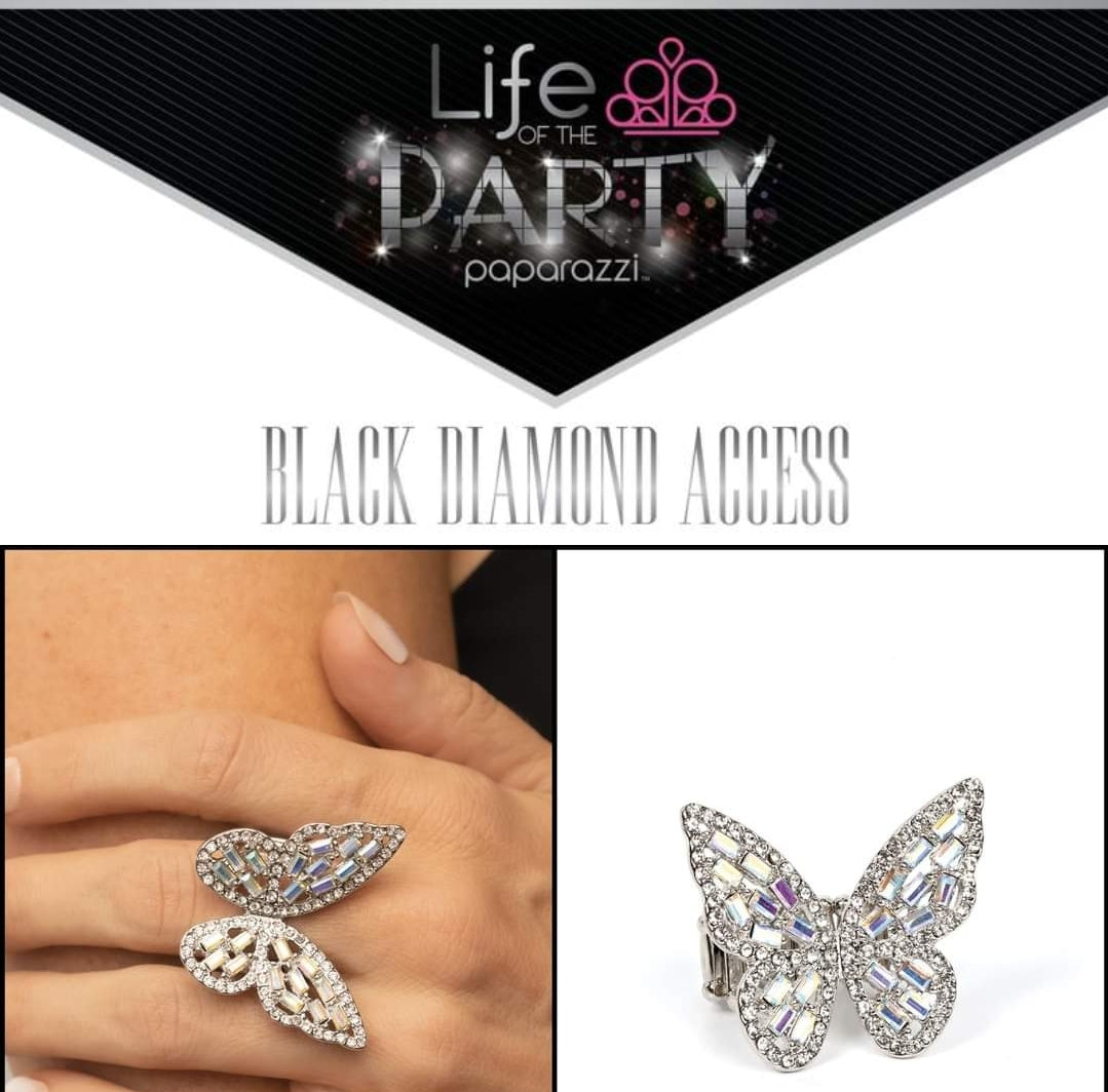 Dainty iridescent emerald style rhinestones are sprinkled across the wings of a silver butterfly that is encrusted in glassy white rhinestones for a dramatically dazzling finish. Features a stretchy band for a flexible fit.
