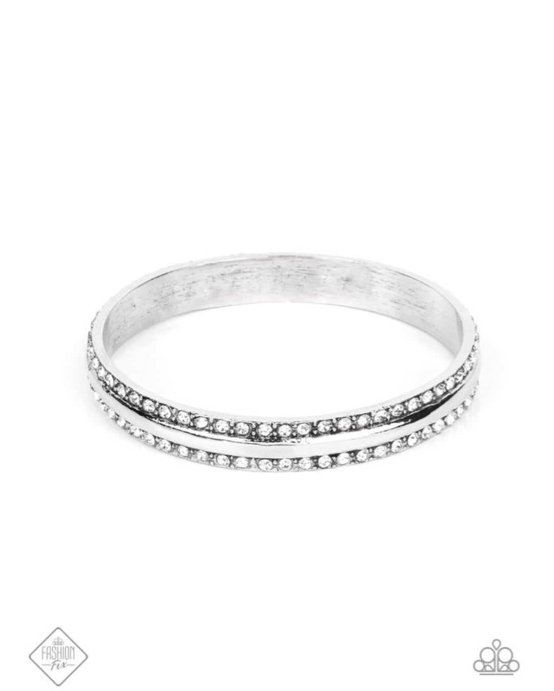 A thick band of silver forges around the wrist to create an industrial-inspired bangle. Dainty white rhinestones run along each side of the high-sheen silver, adding some understated and unexpected sparkle to the design.