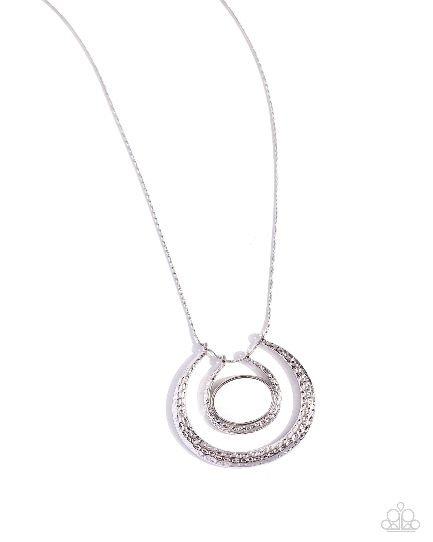 Encased in a sleek silver frame, an oval white shell rests horizontally at the bottom of a curved silver hammered bar, creating a half moon frame at the bottom of a sleek silver snake chain. A larger, curved, half moon frame with a hammered sheen layers below the shell-lined smaller frame for additional eye-catching detail. Features an adjustable clasp closure.