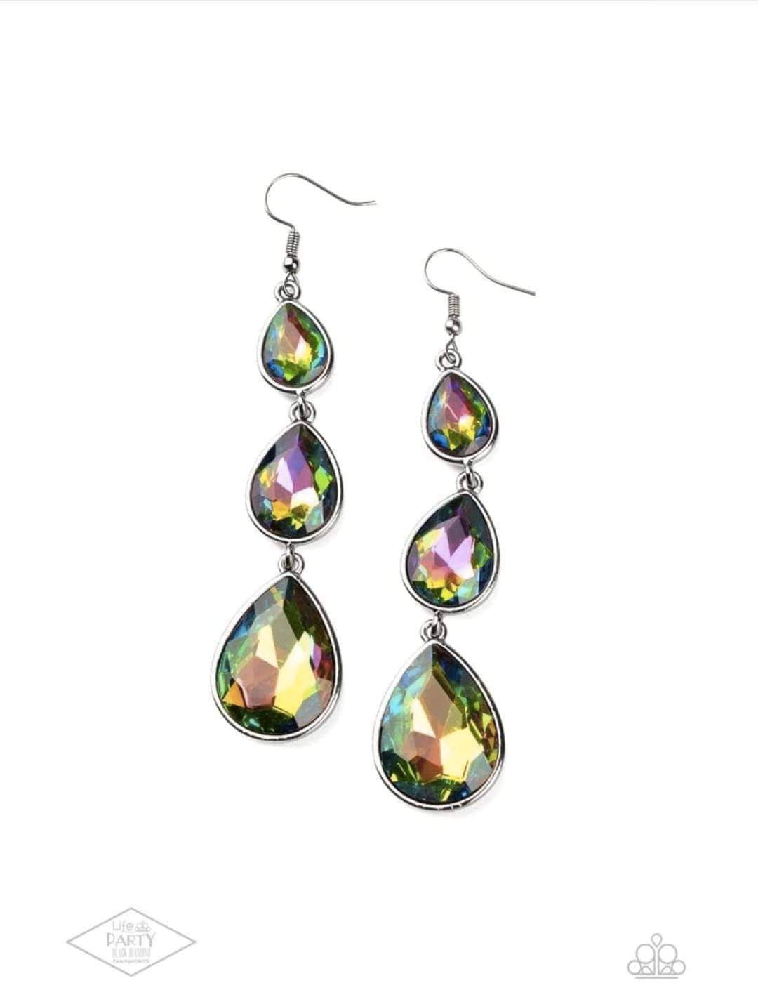 Featuring sleek gunmetal frames, exaggerated oil spill teardrop rhinestones gradually increase in size as they drip from the ear. Earring attaches to a standard fishhook fitting.