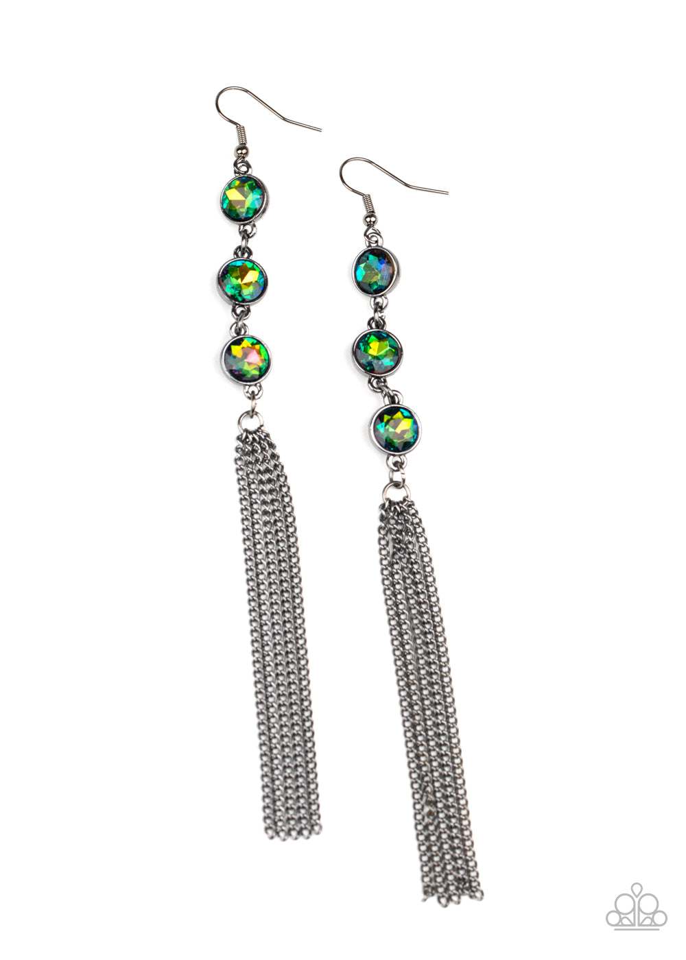 A shimmery gunmetal chain tassel swings from the bottom of a stack of three oil spill rhinestones, creating a fabulously tiered look. Earring attaches to a standard fishhook fitting.