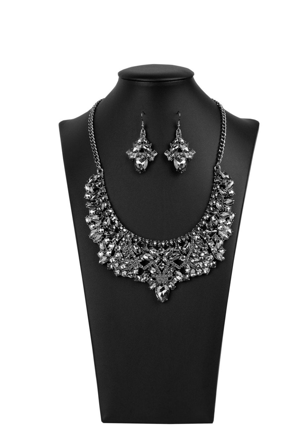 An infinite display of smoky marquise cut rhinestones and dazzling hematite rhinestones meticulously join into three dramatically dazzling frames below the collar. Attached to classic gunmetal chains, the dauntless display of dazzle cascades into an oversized smoky teardrop at the bottom, stealing the spotlight. Features an adjustable clasp closure.