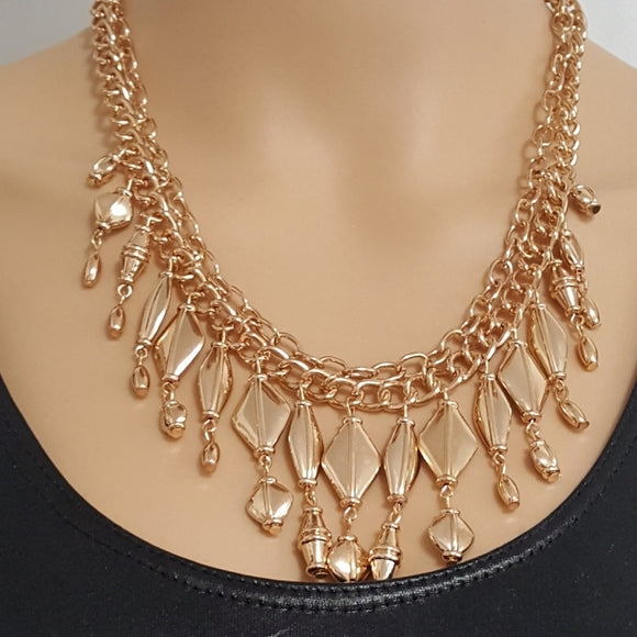 A mismatched collection of gold beaded tassels dangle from the bottom of two interconnecting gold chains, creating a noisy fringe below the collar. Features an adjustable clasp closure.