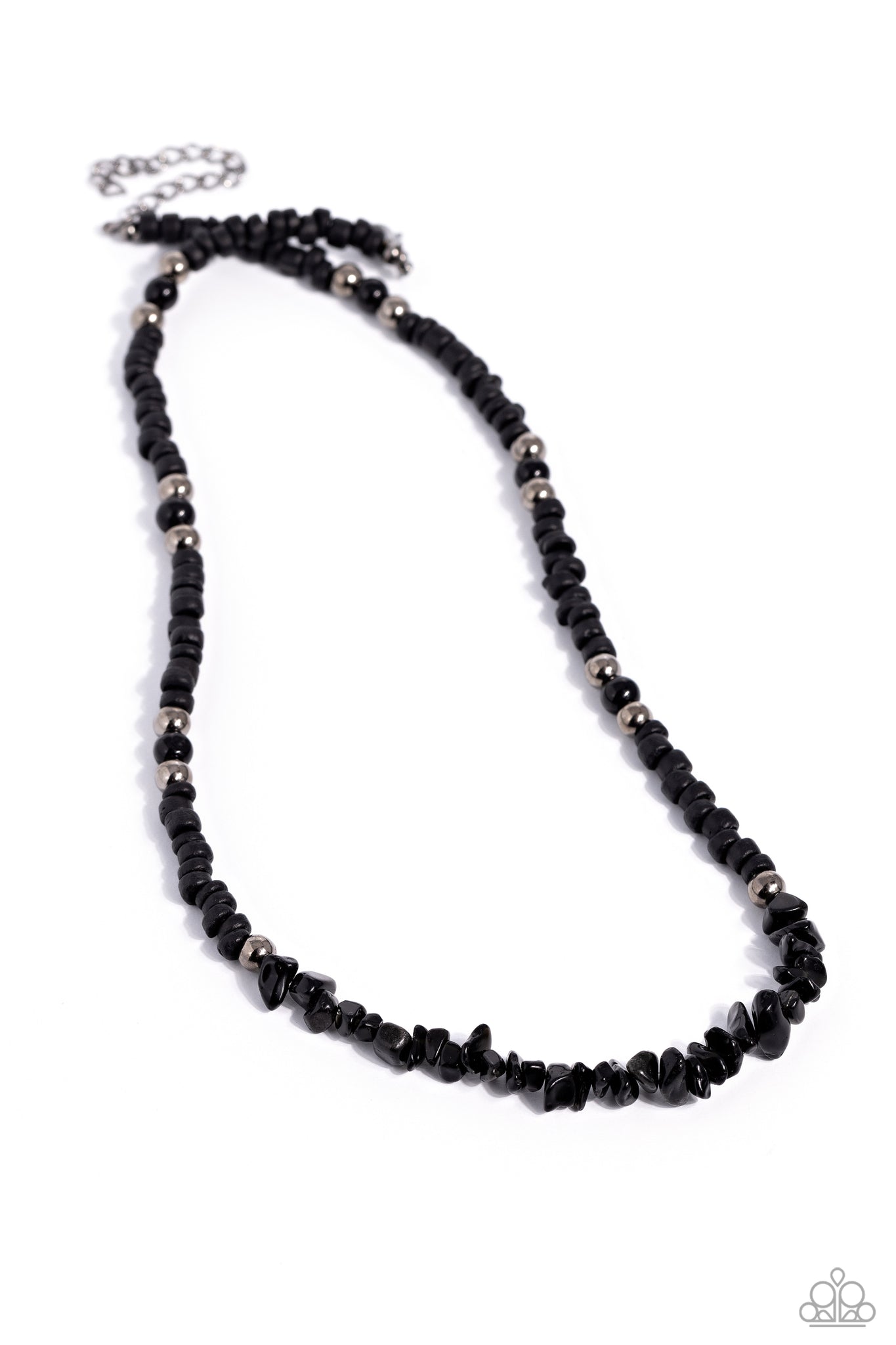 Threaded along an invisible wire, black wooden beads, gunmetal beads, and black pebbles and beads haphazardly coalesce down the neckline for an earthy finish. Features an adjustable clasp closure. As the stone elements in this piece are natural, some color variation is normal.