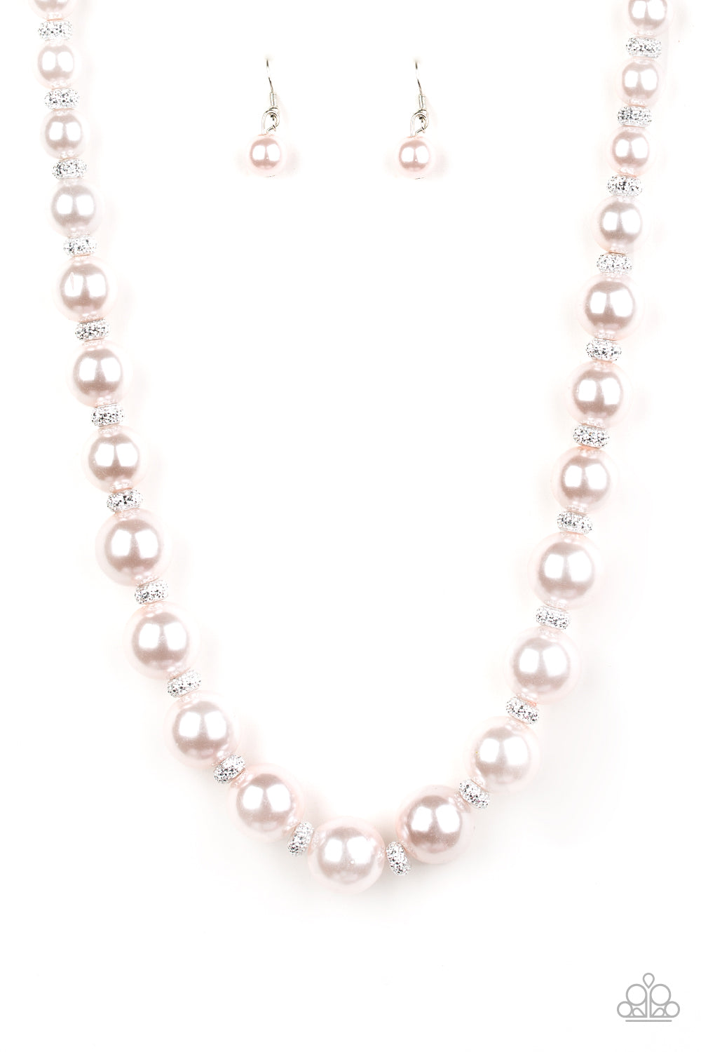 Infused with dainty silvery rhinestone encrusted beads, a refined collection of oversized pink pearls are threaded along an invisible wire below the collar for timeless dazzle.