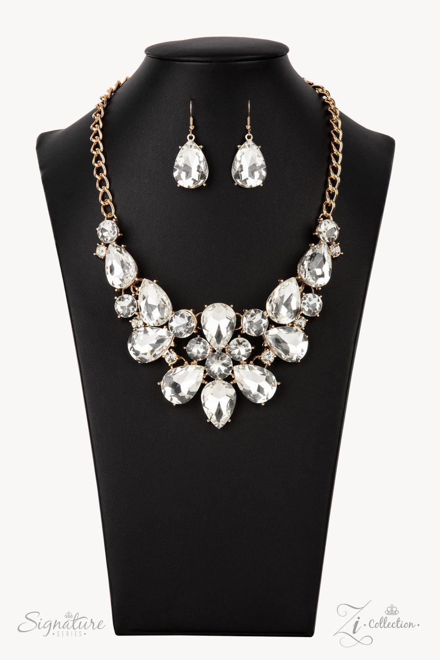 An elaborately exaggerated display of oversized round and teardrop white rhinestones classically coalesces into majestically mismatched golden frames. The dauntless dazzle delicately links below the collar, creating a stunning statement piece jampacked with unapologetic sparkle. Features an adjustable clasp closure.